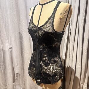 Working luxury, satin trimmed zipper front creates the illusion of a corset with lace tank underneath.