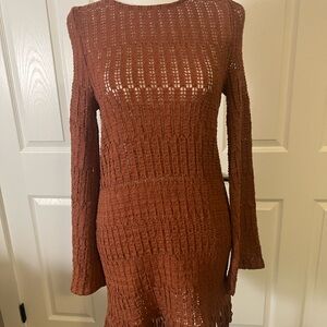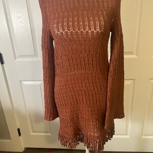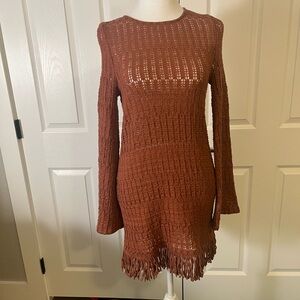 Anthropologie open-knit sweater dress in a rich rust / clay brown tone. Features long sleeves, a crew neckline, and fringe hem detail. Lightweight crochet-style knit with intentional open weave. Designed to be worn layered over a slip or bodysuit.