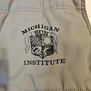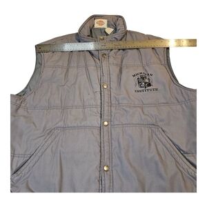 Vintage Dickies puffer vest with functional brass snap buttons. Features include pockets with working zippers and an interior Velcro pocket. The vest has the Michigan Sun Institute emblem on the front. Flaws are indicated with colored arrows in the photos. Note: The color of the item may appear slightly different in person compared to the pictures. Stored in a smoke-free home. Ships within 2 business days. All offers are welcome. #vintage #dickies #puffer #vest #outerwear #michigan #institute