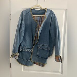 This stunning oversized denim jacket has so many unique features. The paid interior and cuffs that can be reversed, the olive lining, the side slits all make this unique piece a showstopper. Pilling on the inside plaid, see photos. Oversized fit.