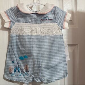 Short sleeve blue and white gingham romper with white Peter Pan collar