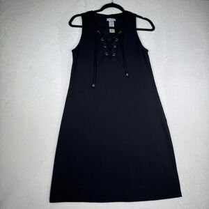 Elevate your wardrobe with this chic Tommy Bahama Island Cays Pique Lace-Up Coverup Black Mini Dress Size S. This sleeveless A-line dress offers a flattering silhouette and features a stylish lace-up neckline with silver grommets, adding a touch of modern flair. The textured fabric provides a sophisticated look and comfortable feel, while the subtle pockets offer practical convenience.