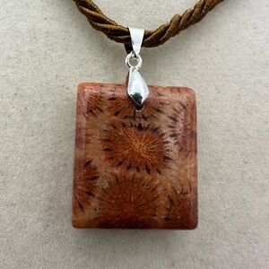 Coral Fossil Pendant Necklace on Brown Satin Polyester Rope