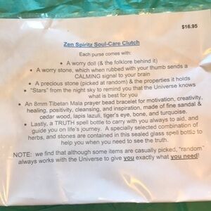 You need a Zen Spiritz Calming Care Mini Purse!! See photos for contents of each clutch. For those who meditate or are prone to nervousness, each purse contains all the tools you need to CALM down & relax. (Clutch’s design picked at random-they are all beauties.)
