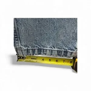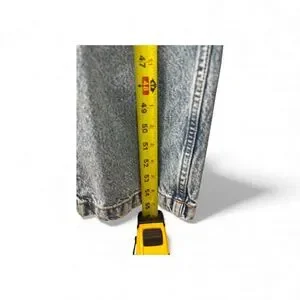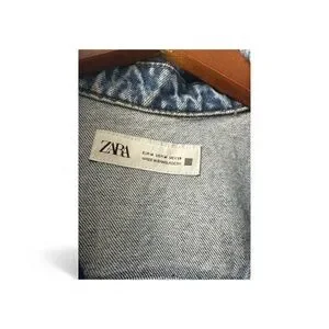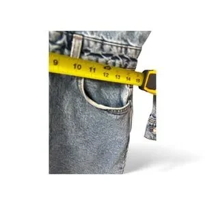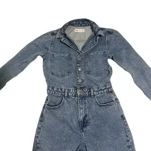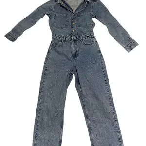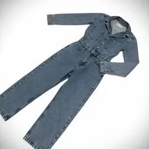 Blue denim jumpsuit with button-up front, belted waist, and long sleeves
