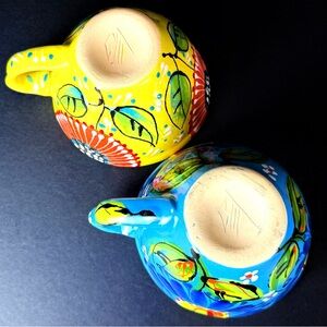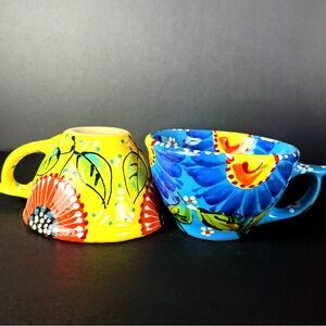 Set of 2 Hand Painted Mexican Clay Mugs Floral Folk Art Pottery Colorful Signed