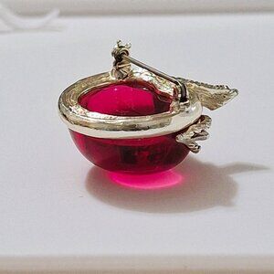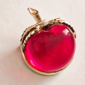 Add a touch of vintage charm to your jewelry collection with this beautiful Sarah Coventry Red Apple Brooch Pin. The stunning design showcases a round Lucite stone in the shape of a bright red apple complemented by an intricate gold tone base and delicate open-work leaves and stem. The brilliant red color reflects light beautifully. The perfect accessory for any occasion: from casual outings to festive parties to formal engagements. The brooch is signed by Sarah Coventry brand and features a secure back closure. A standout piece that's perfect for nostalgic fashion enthusiasts, as well as a must-have for Sarah Coventry designer vintage jewelry collectors.