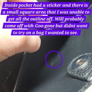 Please see last 3 pictures for minor scuffs on the backside of purse and a sticker outline on the inside pocket (which will probably come off)
