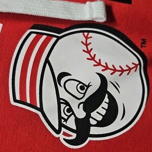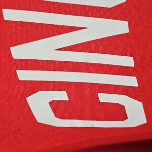 Stylish red and black Cincinnati baseball hoodie with bold lettering and graphic design. Features a front pocket and drawstring hood. Minor imperfection on C (3rd photo)