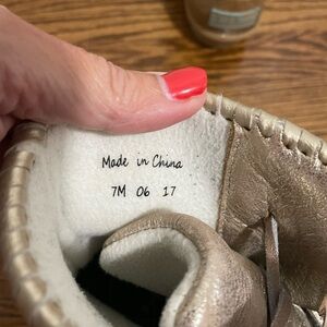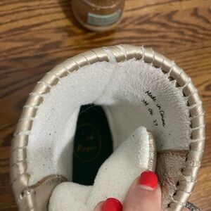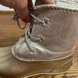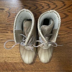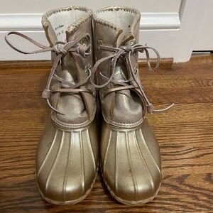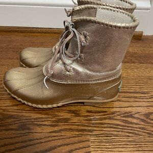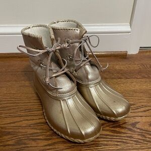 These are ladies Jack Rogers gold rain boots with a fleece lining. They are in great condition and are a size 7.