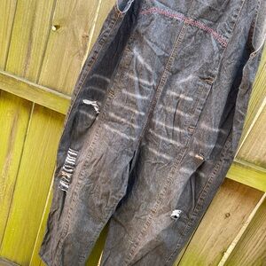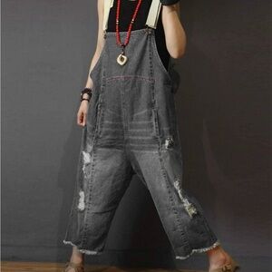 YESNO Women’s Loose Cropped Denim Distressed Grey/Black Overalls (XL) / 14-16