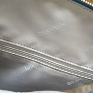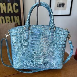 Gorgeous powder blue metallic embossed finish. Measures 10” x 11” x 5. Inside has a zipper compartment, key fob and 2 open pockets.