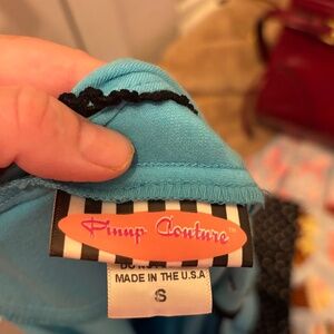 Vintage Pinup Couture! Super FLATTERING on! Accentuating all the right places. Aqua-Turquoise Blue, pirate embroidery on each shoulder. Sweetheart neckline. 90% Cotton 10% Spandex. Size Medium