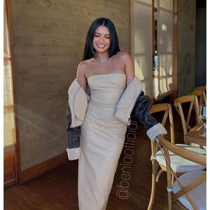Strapless midi dress with straight neckline. Back slit detail and hidden in-seam zip closure.
