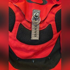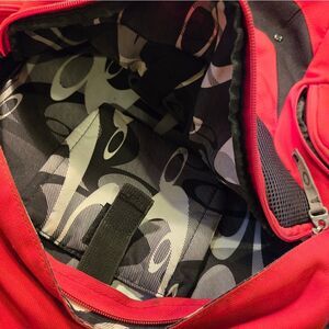 Bold red and black design. Features multiple zippered compartments. Ideal for daily use. 20 x 17 Good condition