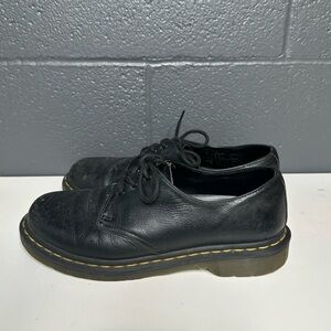 Dr.Martens brand. Black leather shoes. Yellow accent stitching. Pre-owned. Normal signs of use and wear. Sold As-Is.