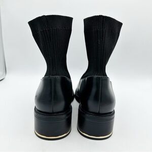 Menswear inspired pull-on almond toe black Chelsea boots feature a ribbed fabric ankle and a stacked heel with a gold accent. Classic and classy, pair these with a suit for work office career or jeans for a casual Fall/Winter vibe.