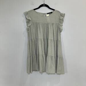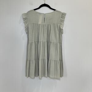 Light green, tiered mini dress with ruffle sleeves and a subtle plaid pattern.