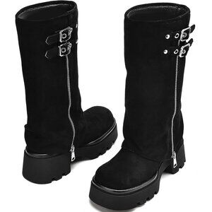 Women's All Black Chunky Slouchy Fold Over Wide Calf Buckle Knee High Boots