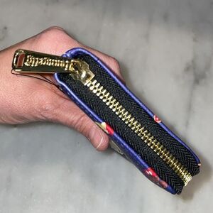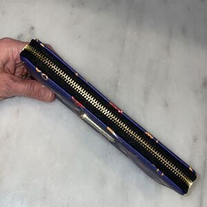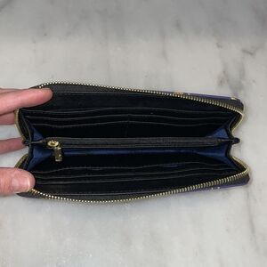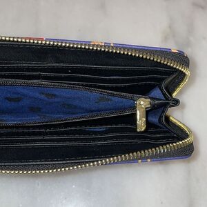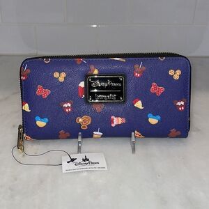 Authentic Lounge Fly Disney Parks with snack food, treats, food leather pattern. Full zipper continental wallet is brand new with tags and a RARE find. Mickey waffle, Dole Whip, Mickey Ice Cream Pop, Pizza, Churros and more with dark blue colored leather background. Gold hardware accents. Full zipper closure opens to an accordion style wallet with two main compartments and a zipper compartment in the middle of the wallet. Four card slots in either exterior compartment for a total of eight card slots. One cash slot on either outer compartment. Approximate measurements: 8" x 4" Photos are part of the description; zoom to see the detailed condition of this brand new, hard to find, collectible Disney wallet. Feel free to ask questions. NEXT DAY SHIPPING!