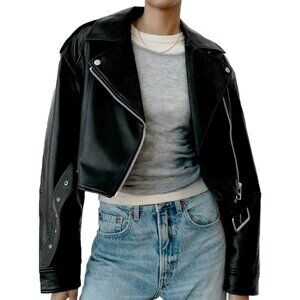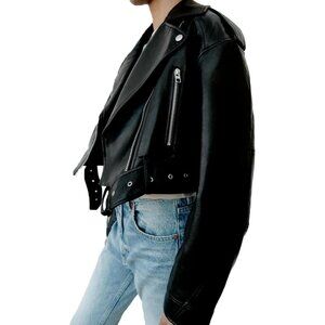 Women's Faux Leather Cropped Jacket Lapel Zipper Biker Short Coat Black