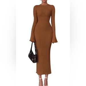 This elegant ribbed knit dress offers a sophisticated look for any occasion. The long sleeves and fitted design create a flattering silhouette. Perfect for both casual and formal events.
