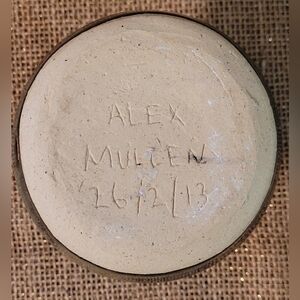 This beautiful handmade pottery vase is sure to impress all who see it. The dark brown background perfectly showcases the swirling shades of green and tan in the glaze. At 4" tall and 3" wide, it fits perfectly in any room. It is also perfectly sized for use as a pen cup or simply as a decorative accent. Excellent condition and signed by the artist