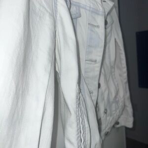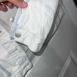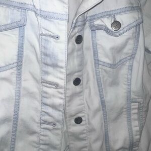 Chic LOFT denim jacket with a light wash. Features buttoned front and pockets. Perfect for layering.