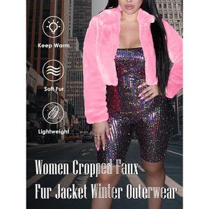 Women's Soft Warm Faux Fur Lapel Long Sleeve Loose Short Cropped Shaggy Jackets.
