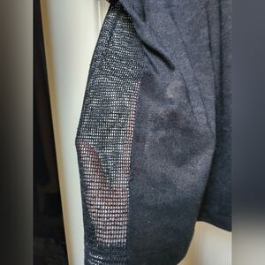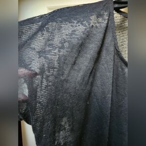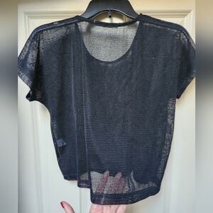 This fun black sheer top is perfect for layering. Its lightweight design offers comfort and style. Front features scoop neck design with sheer, burnout style fabric. Back is mesh.