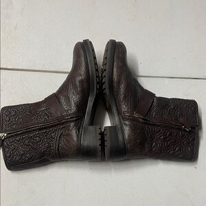 Elegant dark brown leather boots with embossed design. Features dual buckle accents. Ideal for a chic look.
