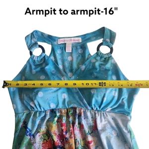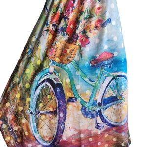 Inspired by the Florida lifestyle, Leoma Lovegrove designs incorporate vibrant, colorful hues & tropical prints. This colorful dress features a V-neckline with lightly padded bust and a print of an original Leoma Lovegrove Florida Life artwork of a bicycle with a floral basket on the beach.