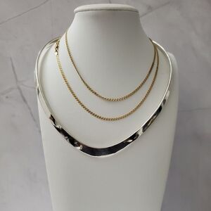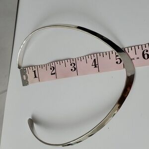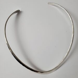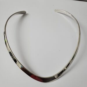 Description: This sterling silver necklace is the epitome of timeless sophistication, showcasing a bold, sleek design that gracefully hugs the neckline. The wide, polished surface gleams with a mirror-like finish, capturing and reflecting light with every turn. Its clean, curved form exudes understated elegance, making it the perfect statement piece for both formal and casual ensembles.