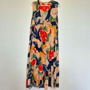 Tags: Orientique floral dress, sleeveless summer dress, rayon midi dress, boho vacation outfit, tropical floral print, lightweight flowy dress, Australian designer fashion, Orientique size M