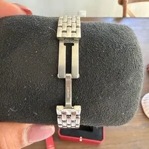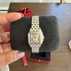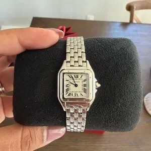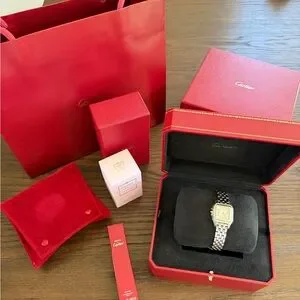 Sophisticated Cartier watch with a sleek silver and black design. Includes original red packaging, cleaning kit, travel bag, and two perfume samples (unopened or used).
