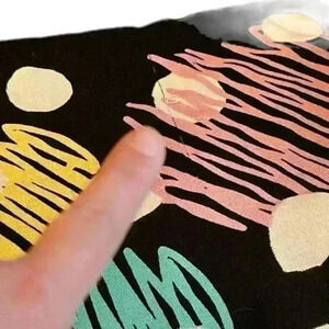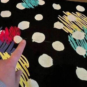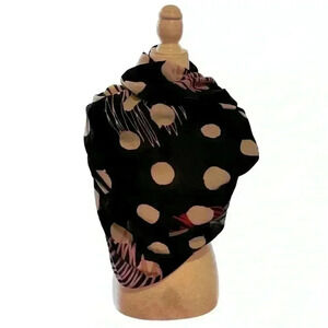 Lightweight, vibrant colors, black with middle size white polka dots, very airy, great for spring or fall