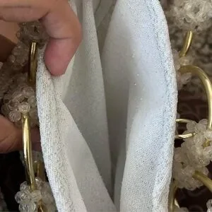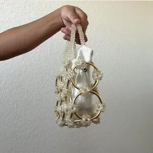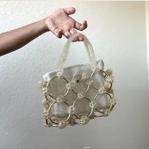 This elegant handbag features a unique design with gold accents and a cream base. Perfect for adding a touch of sophistication to any outfit.