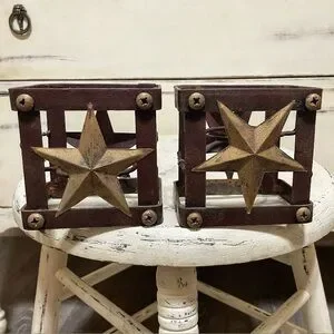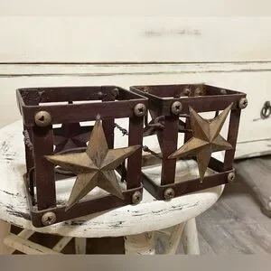 Add a touch of rustic charm to your home with these vintage, distressed, weathered star-shaped candle holders. Pre-owned with a warm brown and gold finish, they complement a variety of décor styles. Perfect for staging in a cabinet, log home, or Airbnb, these pieces bring a cozy, inviting glow wherever they’re displayed.