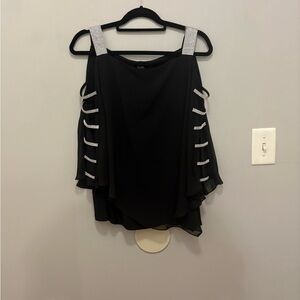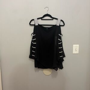 Stylish black top with silver embellished straps. Perfect for evening wear. Flowy and elegant design.