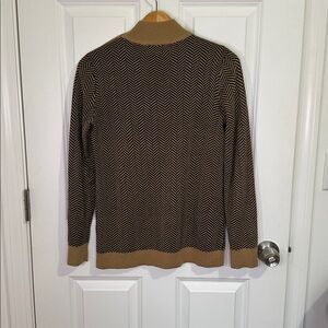Elegant Calvin Klein sweater with chevron design. Features tan and black colors. Mock turtleneck style with button detail on shoulder.