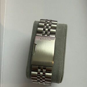 Elegant Fossil watch with a skeleton dial. Silver metal bracelet adds sophistication. Watch is perfectly functional
