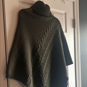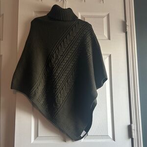 Stay cozy and stylish with this olive green turtleneck poncho sweater. Perfect for layering in cooler weather.
