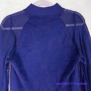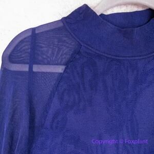 If you want the comfort and fit of a sweater dress with a bit more sophistication, this is that dress. The body is made of jacquard sweater fabric, but the long sleeves are sheer up to the shoulder and throughout the high crewneck. The gorgeous dark blue color makes it a neutral, but there is a whisper of a print to keep it interesting.