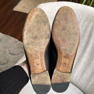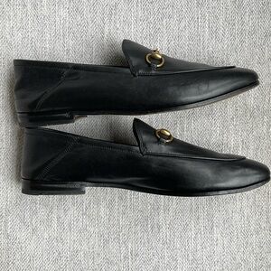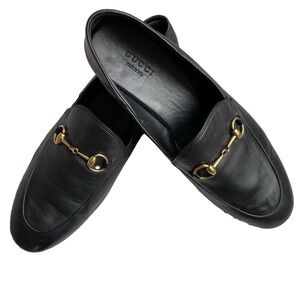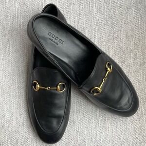 Gucci Brixton Black Leather Goldtone Horsebit Hardware Foldable Loafer Mule Size 9. One owner. Excellent condition! Buttery soft genuine leather. Goldtone horsebit hardware. Low, 1/2” heel. Leather lining. Leather sole. Can be worn with heel up as a loafer or folded down as a slip-on mule. These were only worn with the heel up.