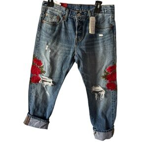 Levi's women's Blue Jeans with Red Floral Accents 28 waist and 26 length NWT