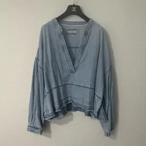 Stylish denim top with a V-neck. Features long sleeves and a relaxed fit.