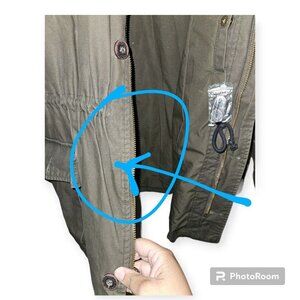 One button is missing. It is the second button from the bottom. The coat comes with two replacement buttons. This has been reflected in price.