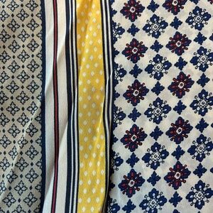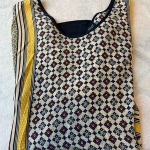 Chic blouse with geometric design. Features navy and yellow accents. Ideal for versatile styling.