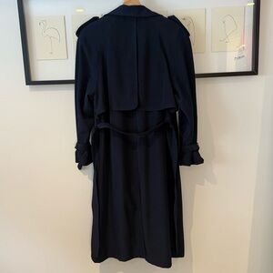 Elegant dark blue trench coat. Timeless style with button closure. Ideal for versatile wear.