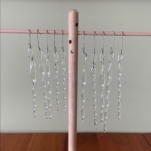 These elegant hand blown glass icicle ornaments are beautiful. Each one is individually unique, just like real icicles. Consequently, their lengths vary, too, from about 4 inches to about 5 1/2 inches (~4" to 5.5"). They can either be hung using the small metal hanger or with colored ribbons.They add a beautiful wintry elegance to any holiday tree, window treatment, or anywhere else they are hung. They are not limited to the holidays; they can evoke winter's beauty at any time, almost anywhere. They are lightweight and will be securely packaged. (Shout out to the pasta drying rack for stepping in to help display these lovelies.)